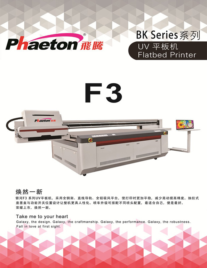 銀河F3系列UV平板機(jī),采用全鋼架、直線導(dǎo)軌、全鋁吸風(fēng)平臺,使打印時更加平穩(wěn),減少晃動提高精度。抽拉式廢墨盒與功能開關(guān)位置設(shè)計讓整機(jī)更具人性化。噴車升級可搭配不同噴頭配置,最適合自己,便是最好。 榮耀上市,煥然一新。